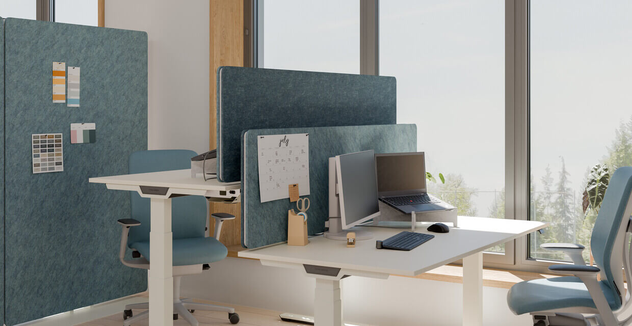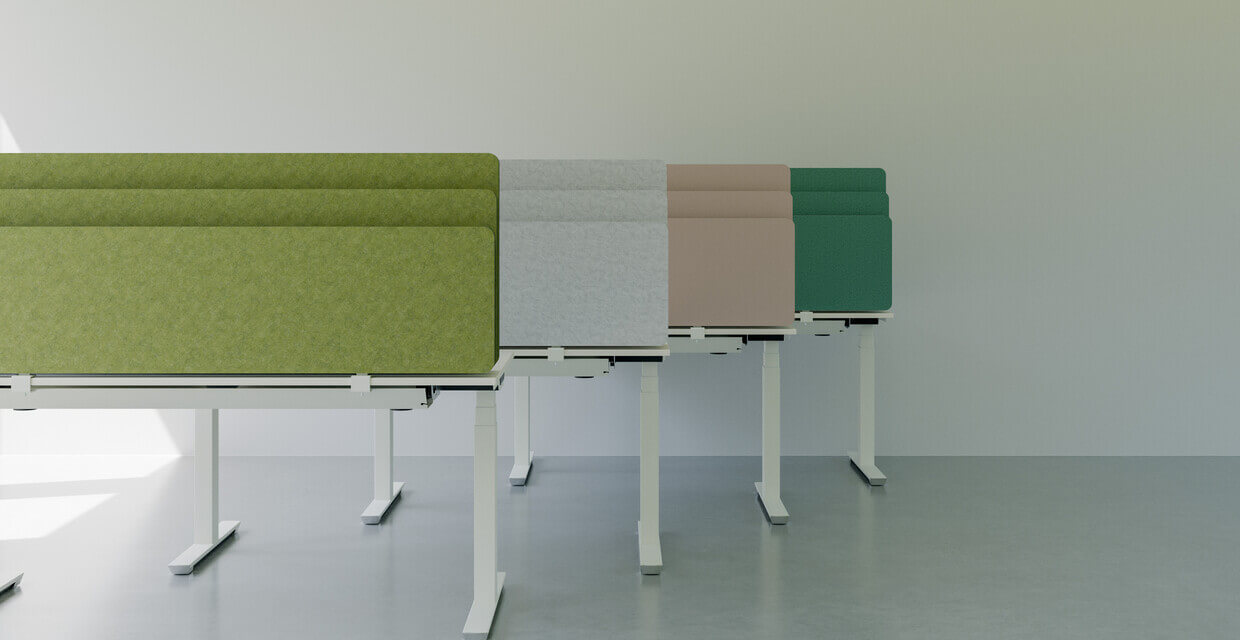 Die BELT Tischaufsätze verbinden funktionales Design mit akustischem Komfort und lassen sich mühelos an Einzelarbeitsplätzen oder Bench-Systemen anbringen – wahlweise durch Klemmung oder Verschraubung. Ihre mehrschichtige Konstruktion aus robusten Polyesterfaserplatten und einer zusätzlichen Polyestervlies-Füllung erzielt einen Schallabsorptionsgrad der Klasse C (nach ISO 11654) und verbessert damit spürbar die Raumakustik. Für eine individuelle Gestaltung stehen vielfältige Material- und Farbvarianten zur Auswahl – von reduziertem Polyestervlies über textil anmutende Filzoberflächen bis hin zu hochwertigen Schichtstoffdekoren aus dem PALMBERG-Programm.